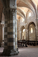 L'interno è straordinariamente suggestivo, le sue pareti nude e le navate vuote con pilastri bicromi, ci riportano all'antica purezza delle forme romaniche.